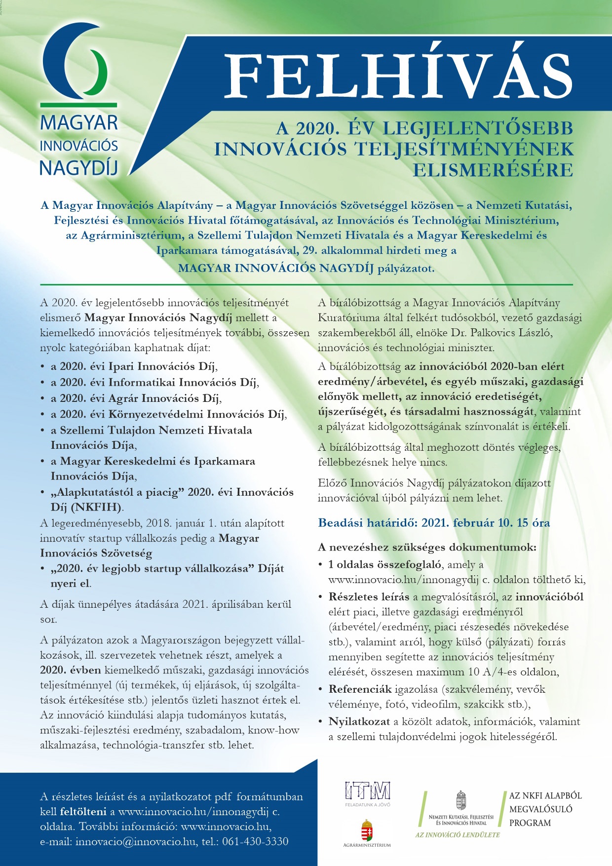 A Magyar Innovációs Alapítvány – a Magyar Innovációs Szövetséggel közösen – a Nemzeti Kutatási, Fejlesztési és Innovációs Hivatal főtámogatásával, az Innovációs és Technológiai Minisztérium, az Agrárminisztérium, a Szellemi Tulajdon Nemzeti Hivatala és a Magyar Kereskedelmi és Iparkamara támogatásával, 29. alkalommal hirdeti meg a Magyar Innovációs Nagydíj pályázatot.
