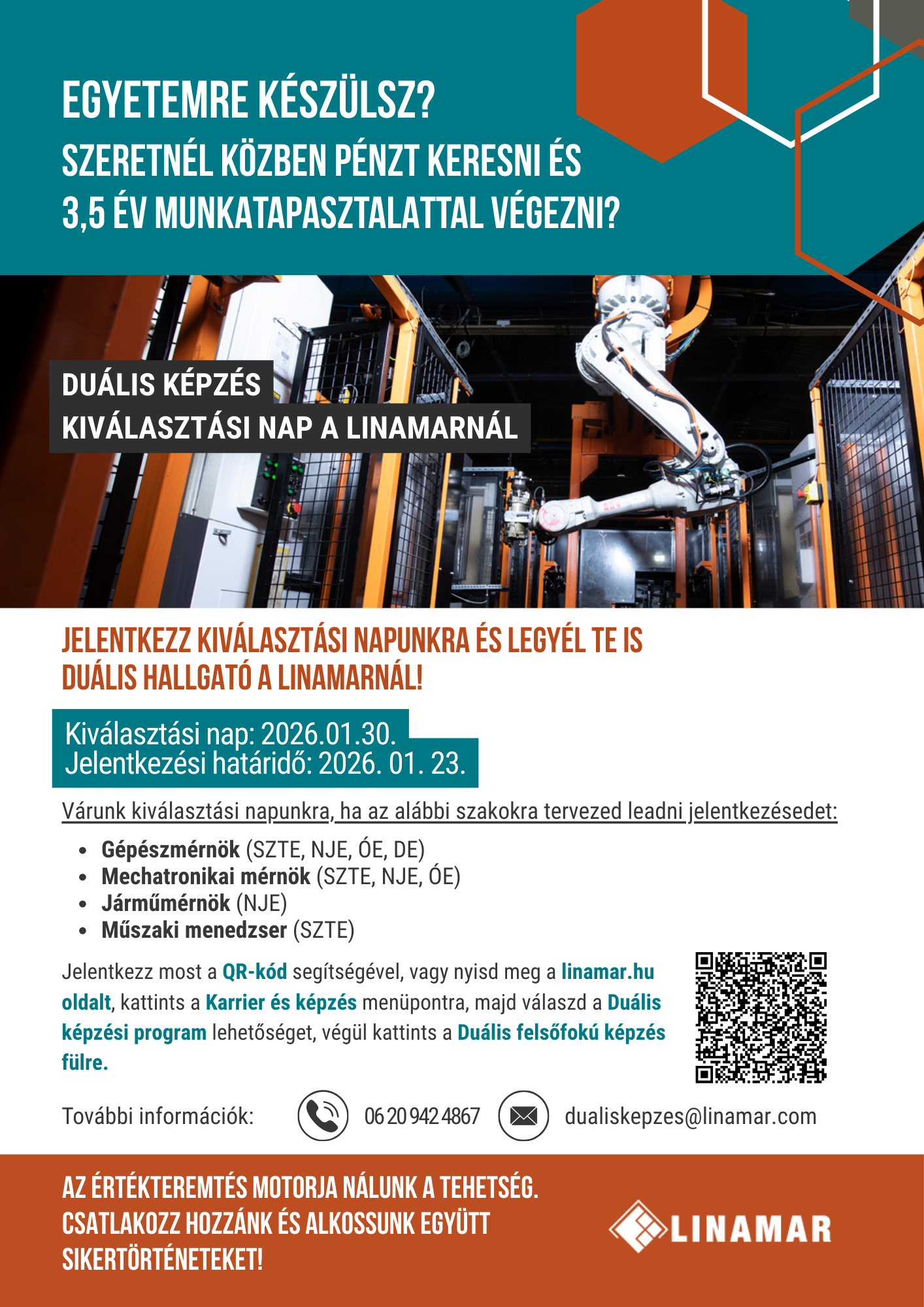 Linamar Hungary Autóipari és Gépgyártó Zrt. Telephelyeink: dualiskepzes[kukac]linamar.com www.linamar.hu https://www.facebook.com/linamarhungary/ Jelentkezés: https://www.linamar.hu/hu/ |